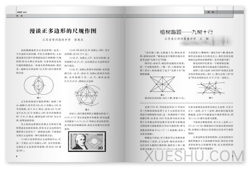 漫谈正多边形的尺规作图,如何地作出正多边形呢?这是一个古老的几何问题.早在古希腊时代,人们就知道可以用不带刻度的直尺和圆规(尺规作图)作出几种正多边形.大家知道复杂的尺规作图都是由一些基本作图构成的,我们先一起探讨正四边形(正方形)的尺规作图的方法,正方形该如何尺规作图呢?如图1所示,画圆○,作半径OA,以A为同心,OA为半径画圆,交于B,C两点,连结OA与BC交于点D,以D为圆心,OD为半径画圆交BC于E,F两点,则四边形OFAE为正方形,证明也较容易。